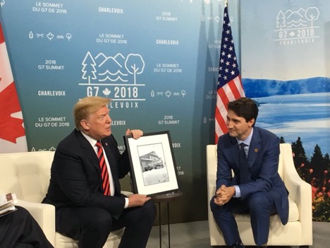 June 2018: Prime Minister Justin Trudeau appeared to attempt a lighthearted moment at the G-7 Summit on Friday when he presented President Donald Trump with a framed photograph of a Canadian hotel and brothel once owned by Trump’s grandfather